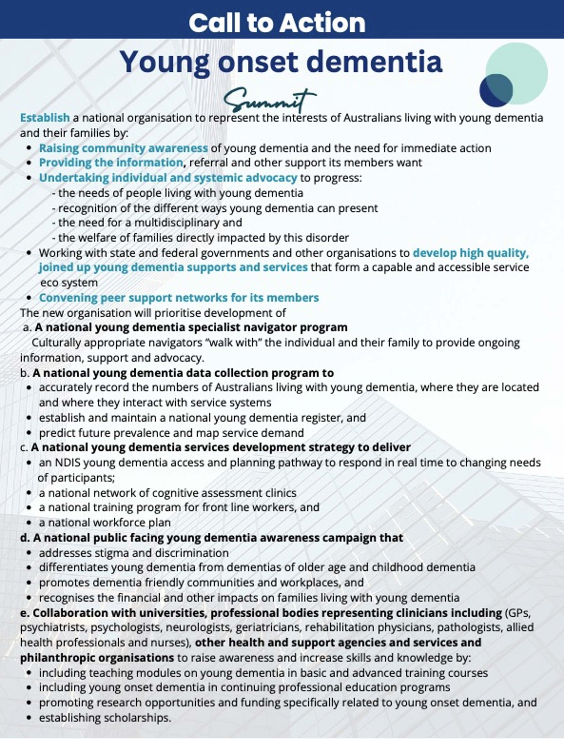 As the first comprehensive analysis of the existing young onset dementia landscape in Australia today, the outcomes of the Project’s extensive stakeholder engagement have informed the system of care the project has developed.